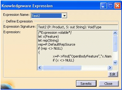 Knowledgeware Expression dialog box to save the new Knowledgeware